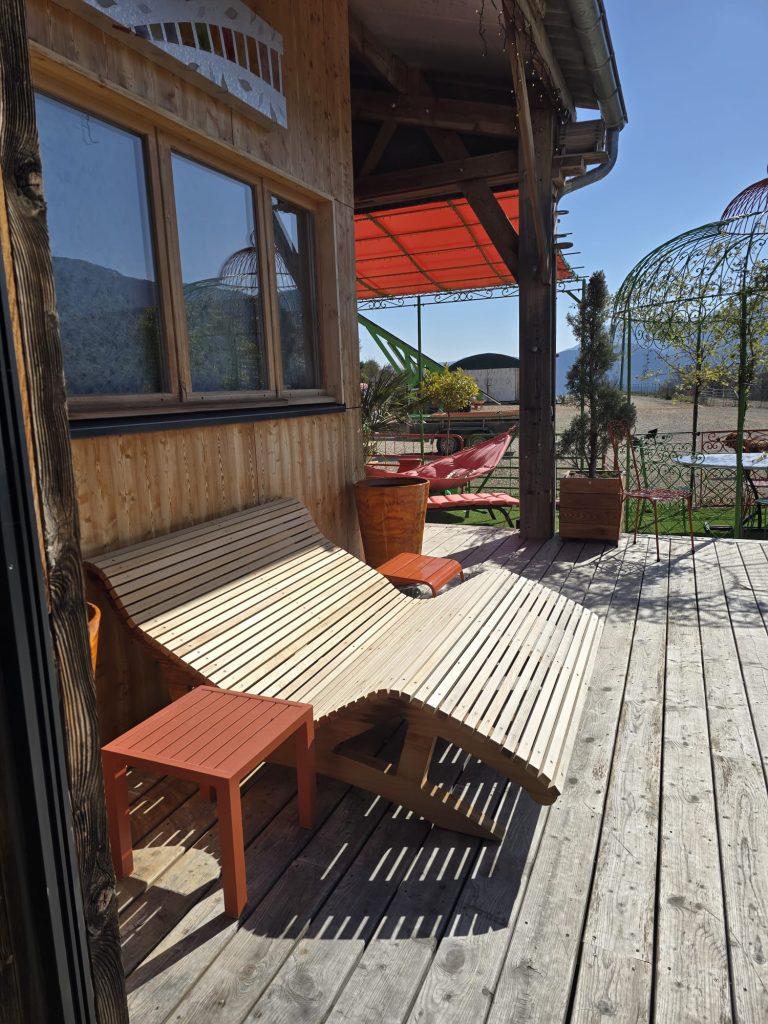 Une chaise longue en bois style Le Corbusier agrémente pour un confort maximal la terrasse accompagnée d’un hamac.